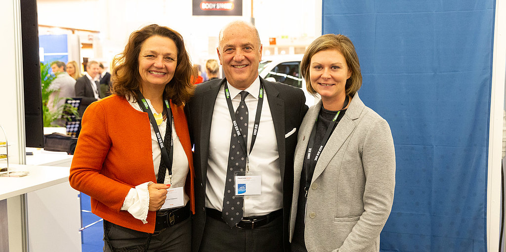 Header: V.l.n.r: Carina Felzmann, unterstützt mit Agentur Cox Orange die internationale Franchise Konferenz, Tom Portesy, President MFV Expositions und einer der beiden Veranstalter, Barbara Steiner, Gen.Sekr. des Österreichischen Franchise Verbandes