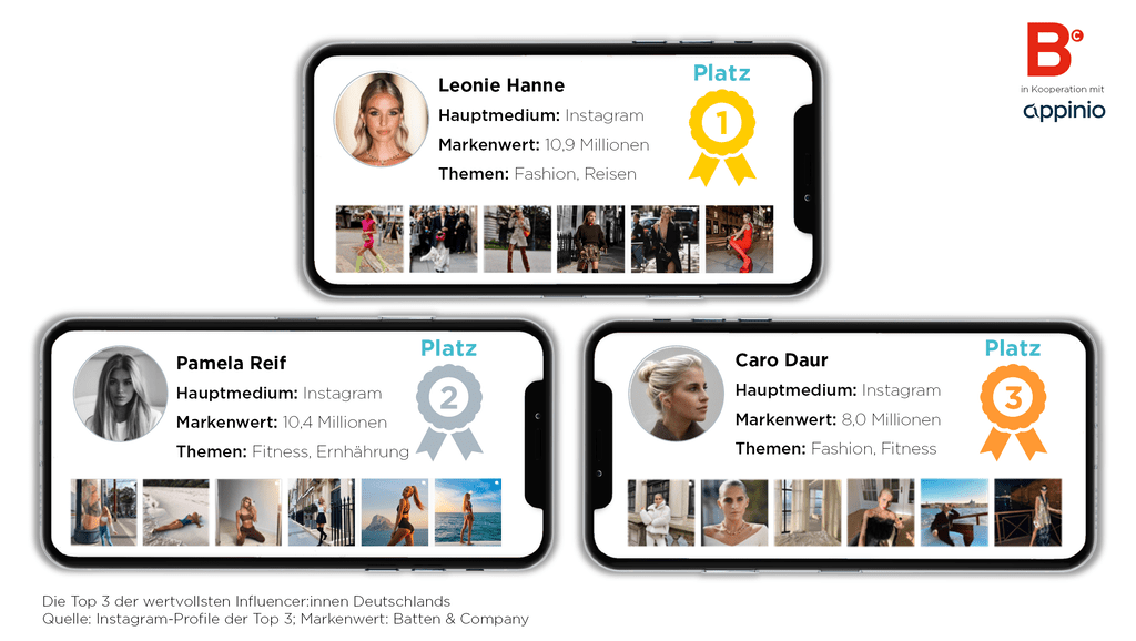 Die Top-Platzierte Influencerin Leonie Hanne erreicht einen beachtlichen Markenwert von 10,9 Millionen Euro, gefolgt von Pamela Reif mit 10,4 Millionen Euro und Caro Daur mit einem Markenwert von 8,0 Millionen Euro. Hinsichtlich ihres Markenwerts können die erfolgreichsten deutschen Social-Media-Stars mittlerweile mit den Top-Spielern der deutschen Fußballbundesliga mithalten. Die insgesamt erfolgreichsten Influencer:innen sind im Bereich Fashion & Lifestyle beheimatet.