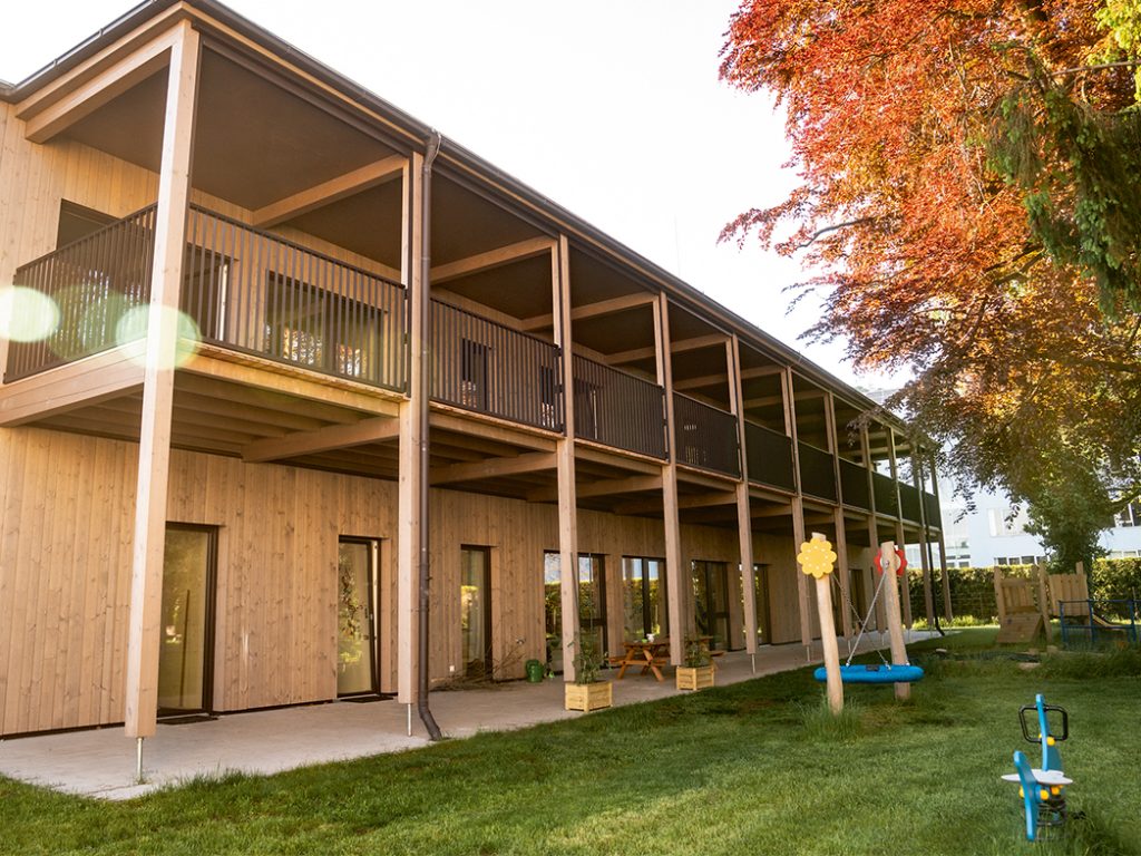„Direkt neben unserer Unternehmenszentrale haben wir letztes Jahr umgeben von Bäumen und viel Grün ein nachhaltiges, energieeffizientes Gebäude für die Kinder der Salzburg AG-Mitarbeiter*innen geplant und errichtet“, erzählt Maria Ziller aus People & Culture der Salzburg AG. Mit 820 m2 Fläche auf zwei Geschossen und 2.000 m2 Garten bietet der Erlebnisgarten Platz für bis zu sechs Gruppen mit rund 72 Kindern im Alter von ein bis sechs Jahren. Durch die offene Struktur des Hauses, das mit viel Holz als Konstruktionsmaterial sowie für Innen- und Außenoberflächen gebaut wurde, kann optimal auf die Bedürfnisse der Kinder eingegangen werden. Denn das Wichtigste für uns: Die Kids sollen sich im Erlebnisgarten rundum wohl fühlen!